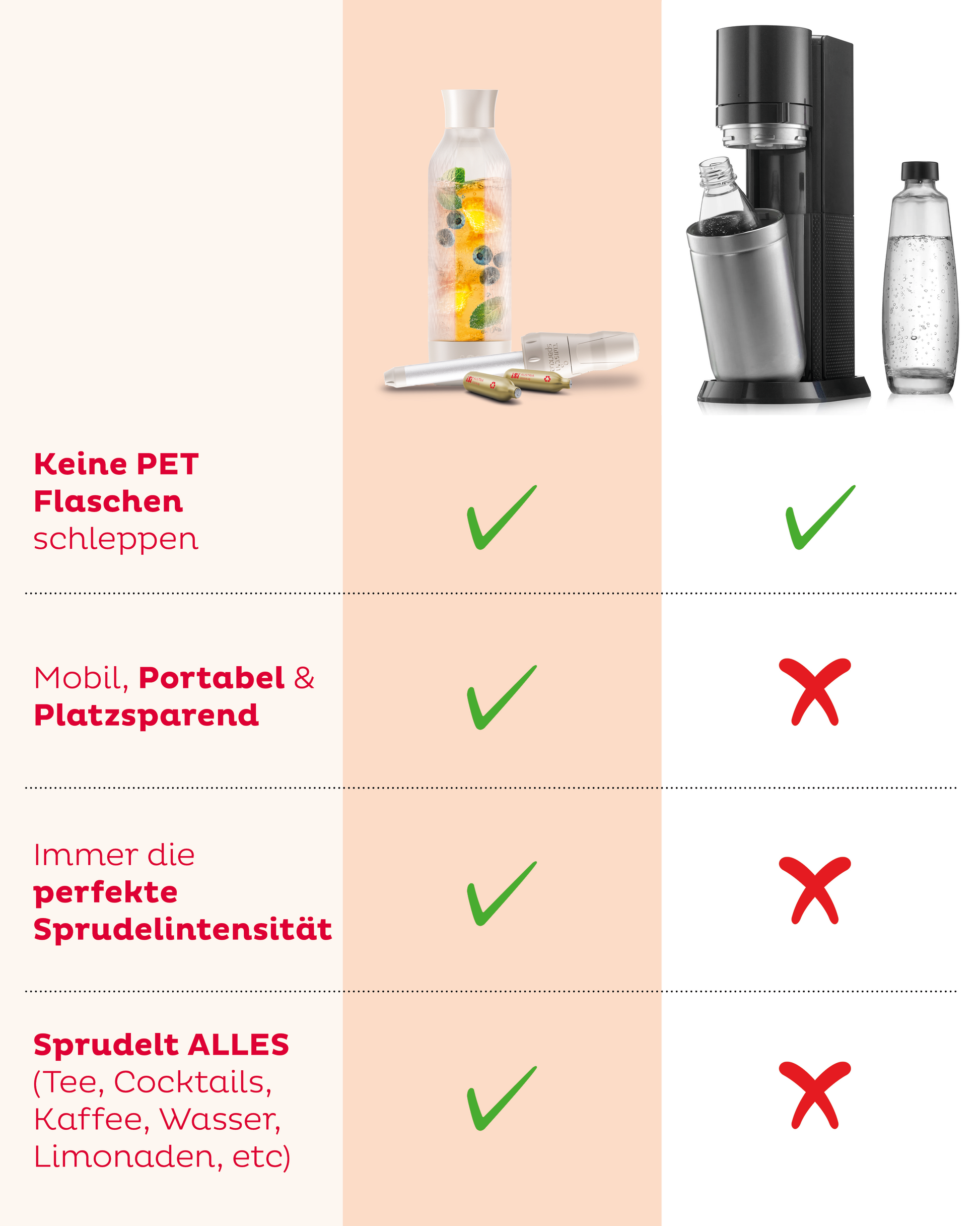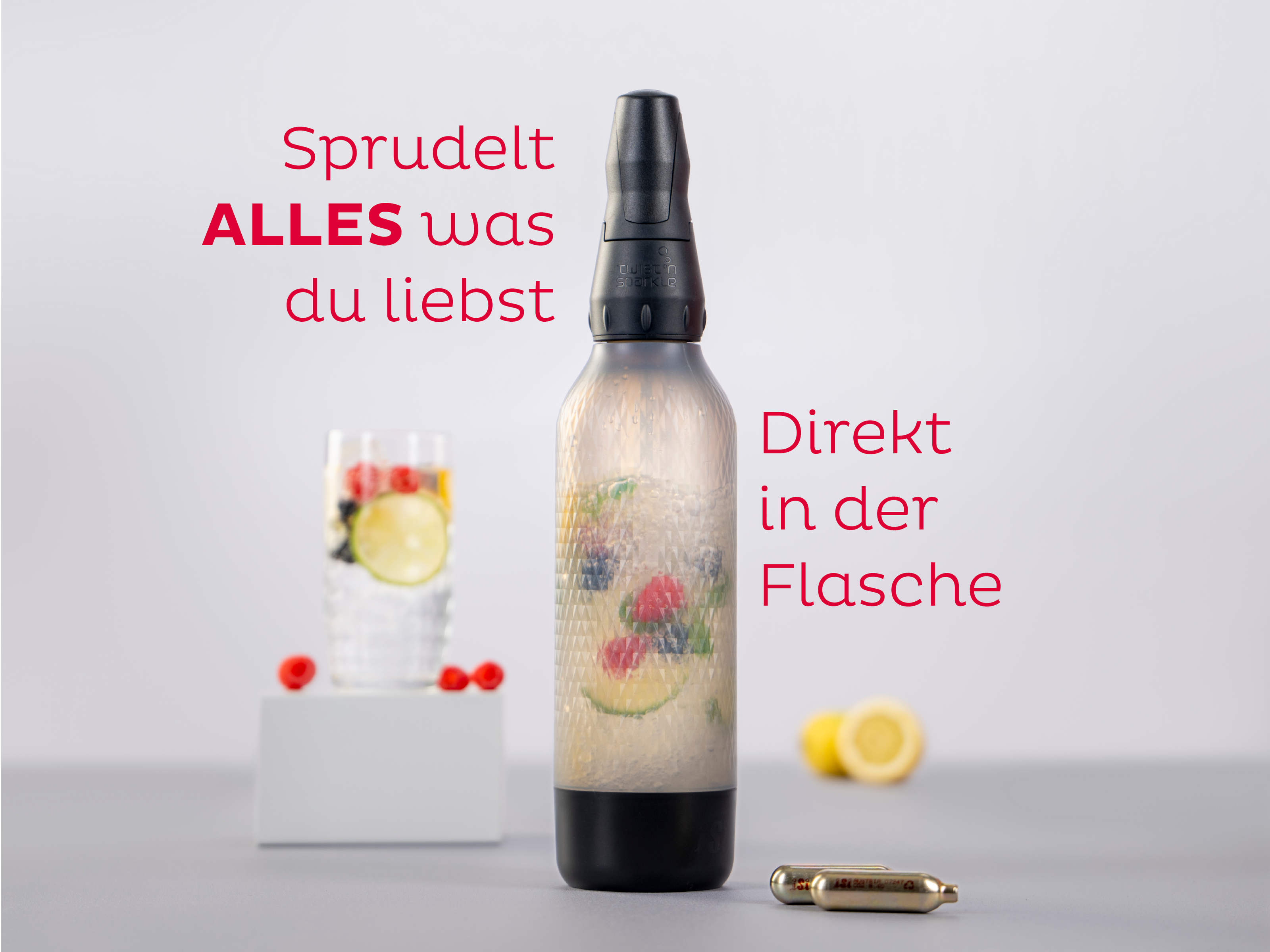 Direkt in der Flasche sprudeln! Immer & Überall. Passt in jede Küche und in jede Tasche.
