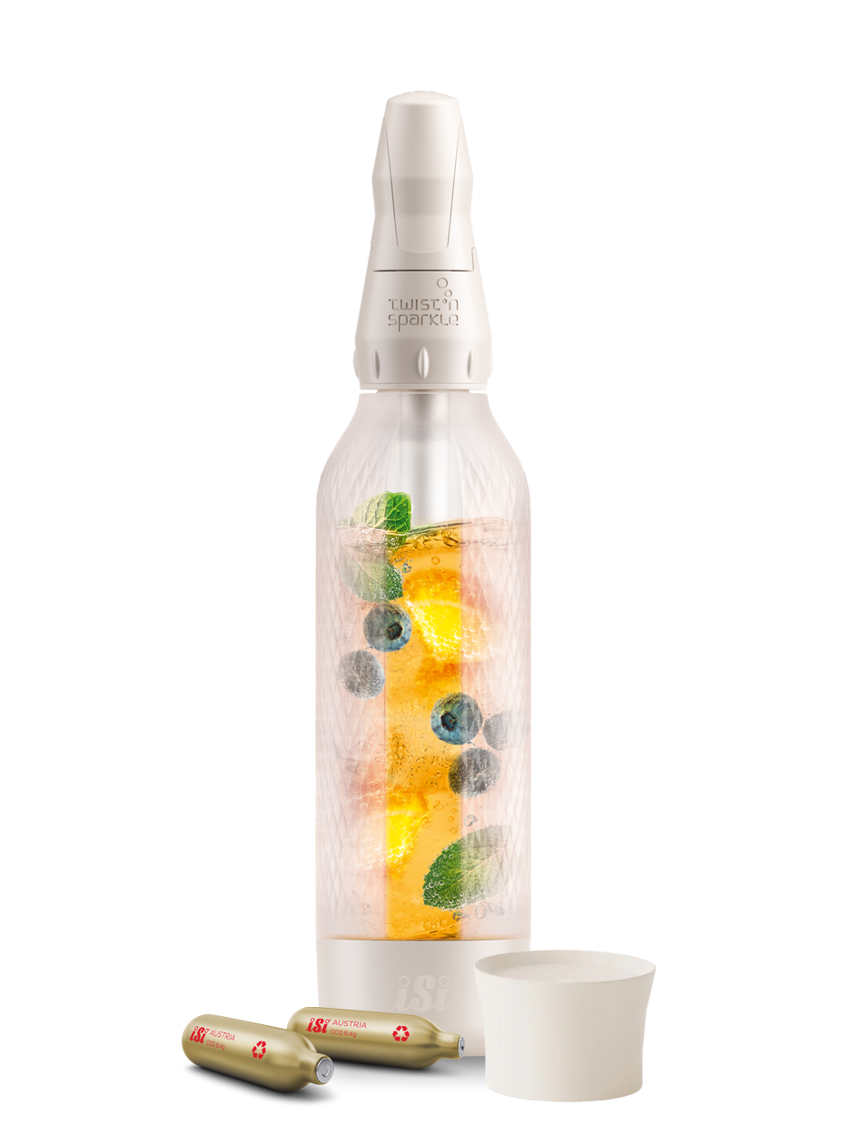 Im Lieferumfang des neuen Twist'n Sparkle Virtuoso sind sowohl die Flasche inkl. Verschlusskappe, der Stab zum Sprudeln und auch 6x iSi Soda Chargers enthalten. Du kannst somit auf der Stelle loslegen und deine ersten Lieblingsdrinks sprudeln.