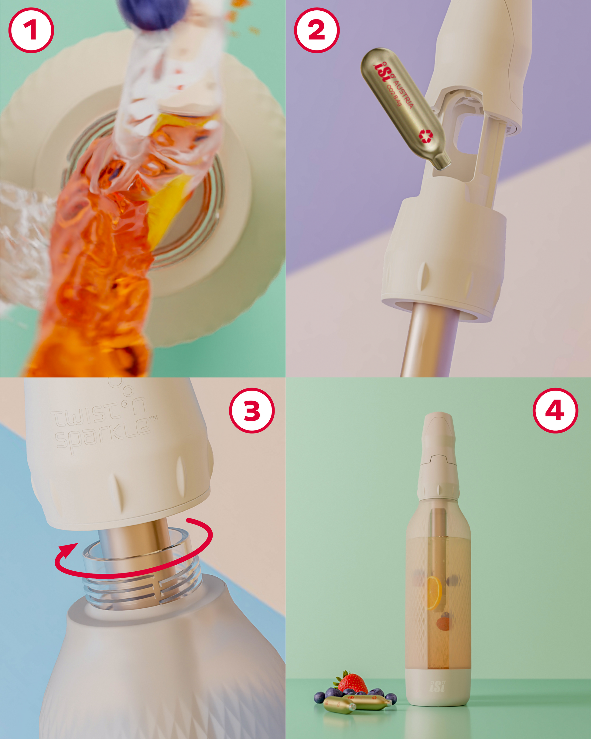 Ob Wasser, Cocktails oder Säfte: Mit dem Twist’n Sparkle Virtuoso sprudelst du alles was du liebst, direkt in der Flasche. Einfach Flasche mit deinen Lieblingszutaten befüllen, iSi Sodakapsel einsetzen, zudrehen – und in Sekunden prickelt dein Lieblingsgetränk. Die patentierte "iSi CO2 Infusion Technologie" sorgt für perfekten Sprudel – direkt in der Flasche. Profi-Tipp: Je kälter das Getränk, desto sprudeliger wird es. Der optimale Fizz entsteht bei ca. 6 Grad Celcius. Eine Zusatzflasche eignet sich optimal, um Getränke vorzukühlen.