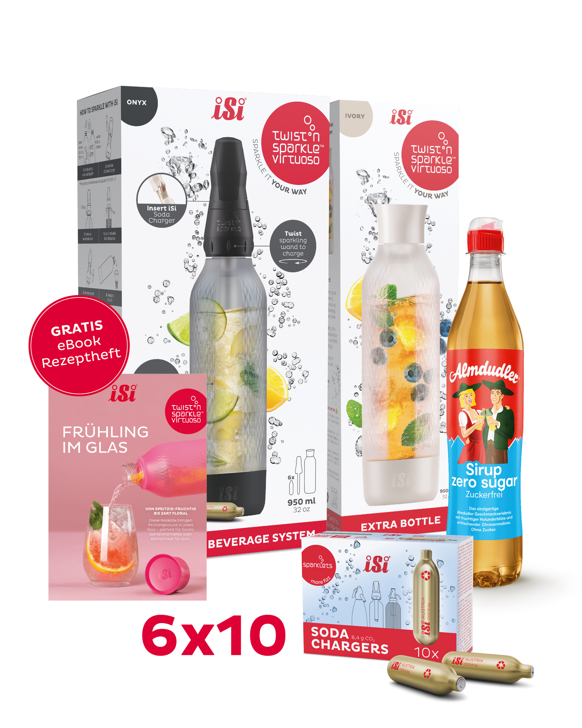 Im Lieferumfang des neuen Twist'n Sparkle Virtuoso sind sowohl die Flasche inkl. Verschlusskappe, der Stab zum Sprudeln und auch 6x iSi Soda Chargers enthalten. Du kannst somit auf der Stelle loslegen und deine ersten Lieblingsdrinks sprudeln.