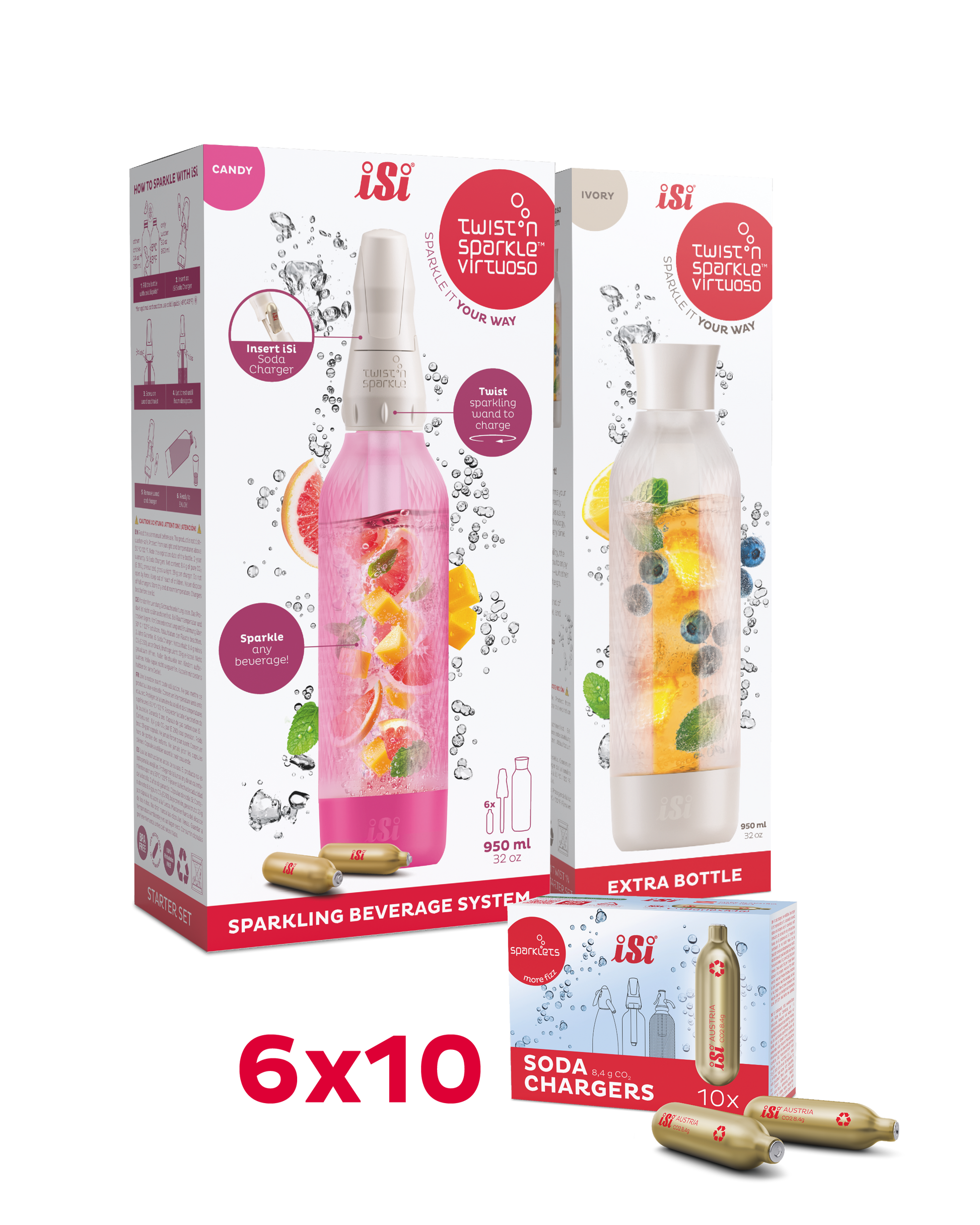 In diesem Bundle erhältst du 1x Twist'n Sparkle Virtuoso, 1 Zusatzflasche und 6x10 Soda Chargers zum Sparpreis. Die Farbe deines Twist'n Sparkle und der Zusatzflache kannst du frei wählen. Somit bist du bereit für heiße Sommertage.