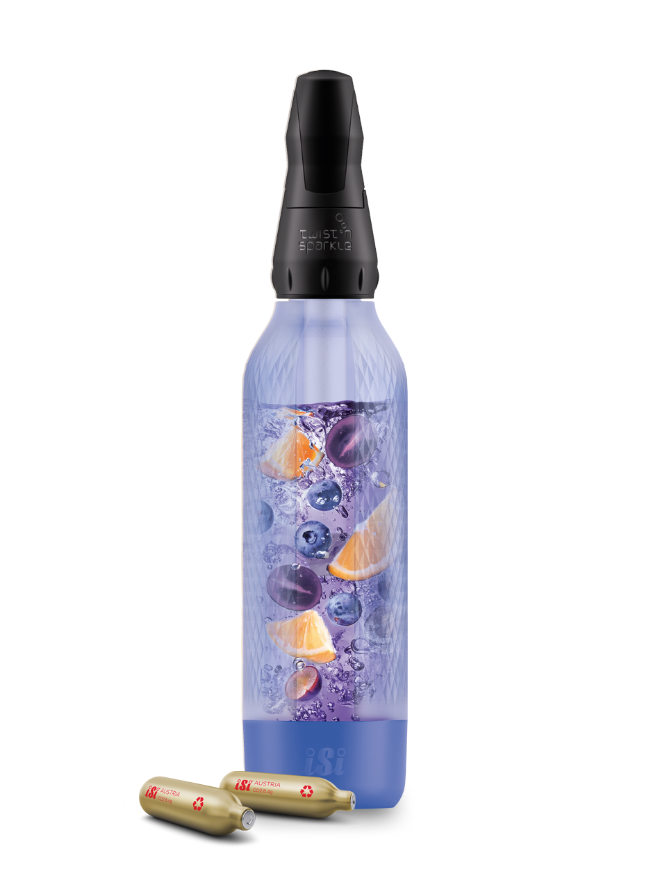Im Lieferumfang des neuen Twist'n Sparkle Virtuoso sind sowohl die Flasche inkl. Verschlusskappe, der Stab zum Sprudeln und auch 6x iSi Soda Chargers enthalten. Du kannst somit auf der Stelle loslegen und deine ersten Lieblingsdrinks sprudeln.